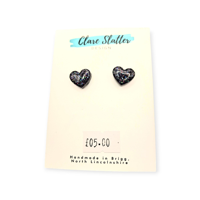 Cute resin heart stud earrings on hypoallergenic surgical steel posts in the colour of your choice. Perfect for Valentine's day or all year round. Please note children under 10 years old should not be given these earrings as they contain small parts that pose a choking hazard. Children should be supervised at all times. Clare Slatter Design accepts no liability for accidents resulting in use contrary to this advice.