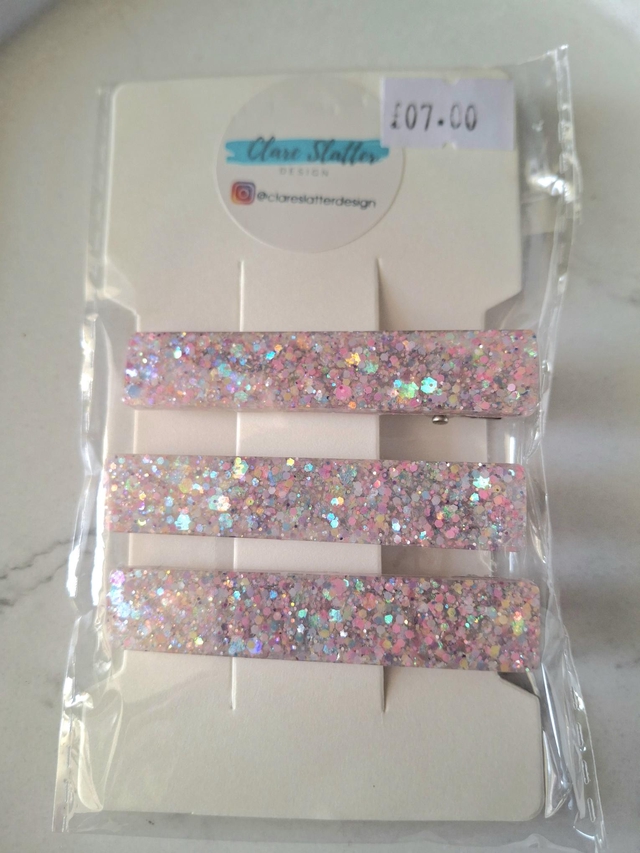 Pink handmade clip trio made from glitter and epoxy resin on a small crocodile clip.