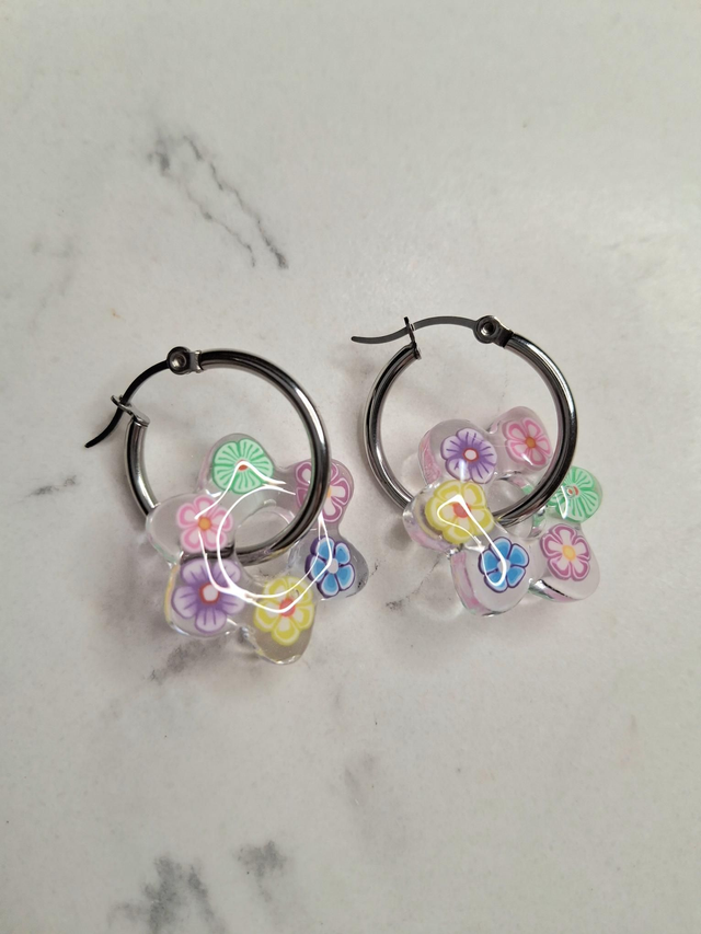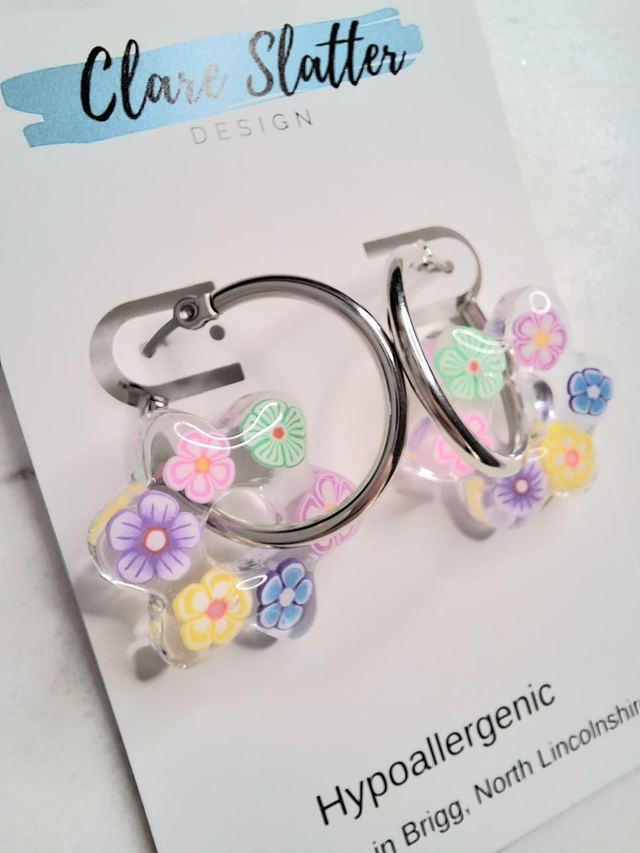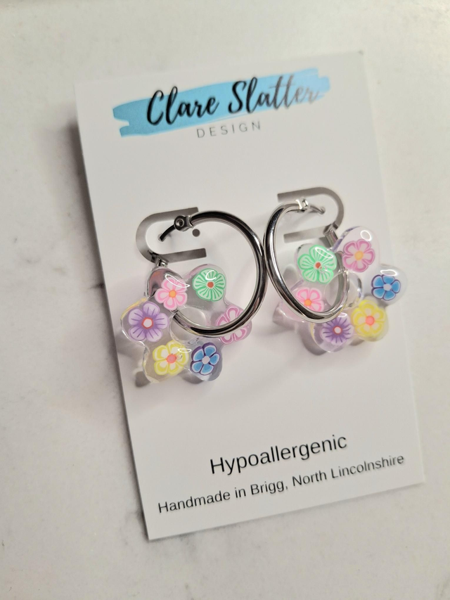 These psychedelic 70s style bright floral earrings will match any outfit. Perfect for spring into summer fashion. Each pair is made from polymer clay flower slices set into lightweight resin on a hoop of your choice.