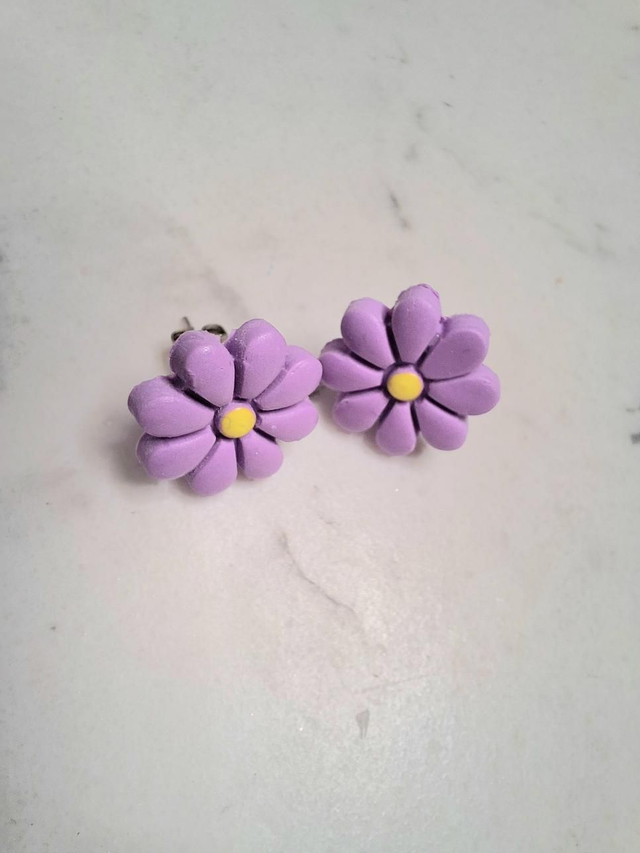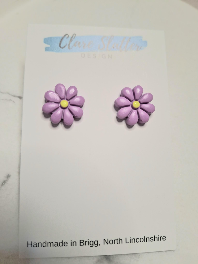 Purple polymer clay flower stud earrings with hypoallergenic stud backs. Please note children under 10 years old should not be given these earrings as they contain small parts that pose a choking hazard.