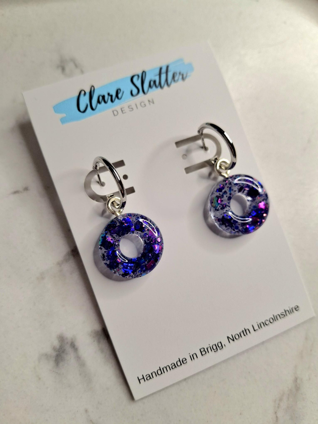 Purpley blue glitter donut hoop charms. On your choice of gold/silver plated or hypoallergenic hoop earrings.