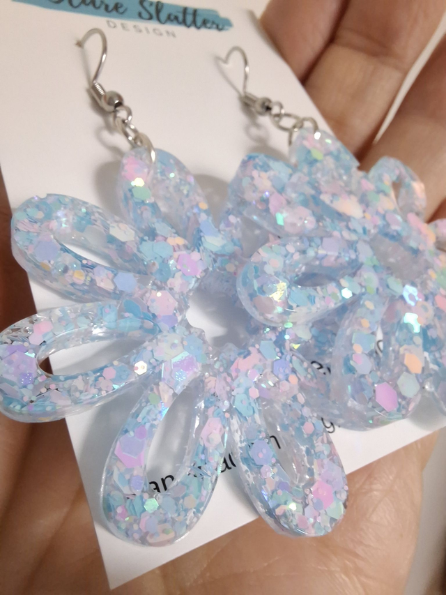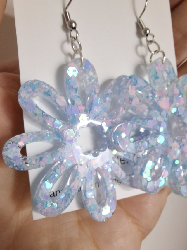 Blue and pink glitter 'bubblegum' resin daisy shaped flower dangly earrings on surgical stainless steel hypoallergenic hooks.