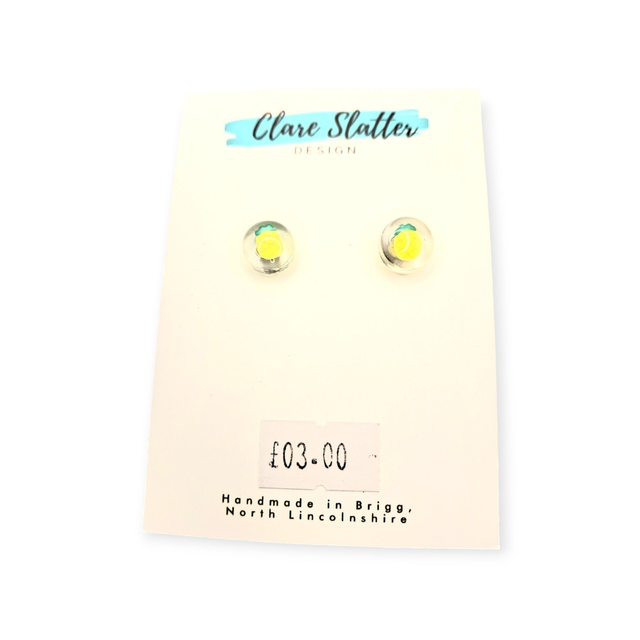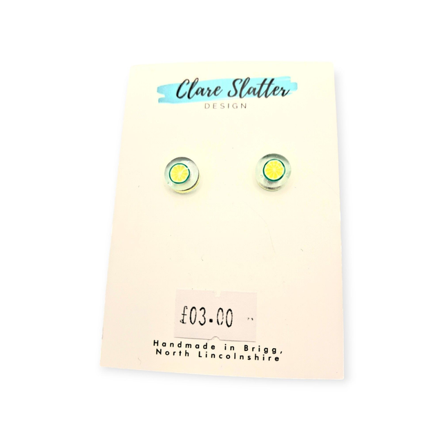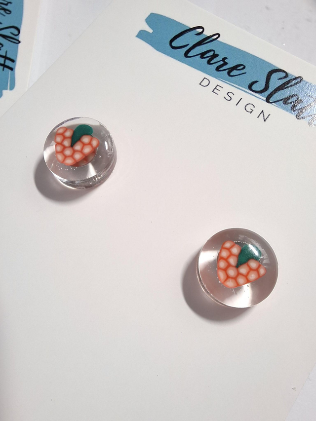 Small resin studs with small fruit polmer clay fruit slices. Choose your own fruit. Hypoallergenic surgical steel posts.Please note children under 10 years old should not be given these earrings as they contain small parts that pose a choking hazard. Children should be supervised at all times. Clare Slatter Design accepts no liability for accidents resulting in use contrary to this advice.