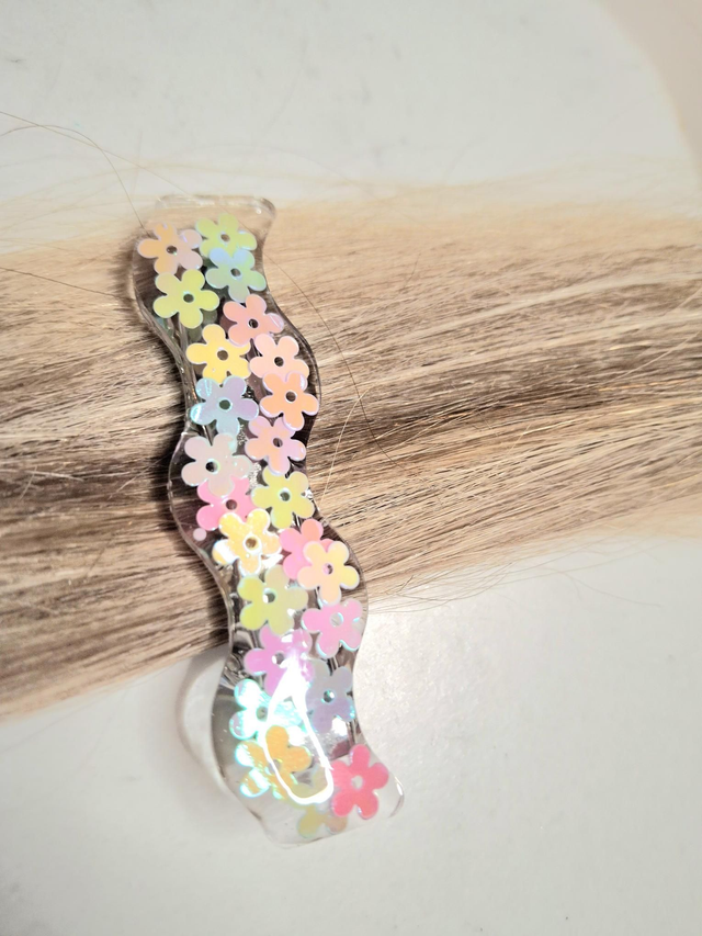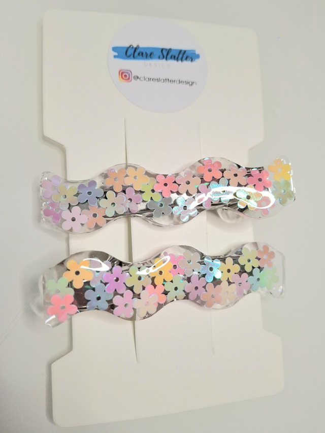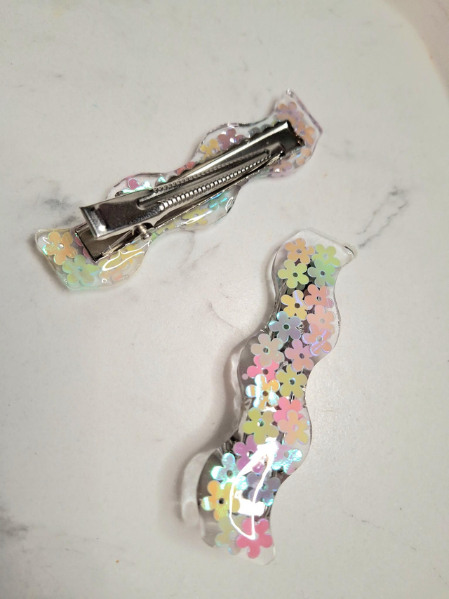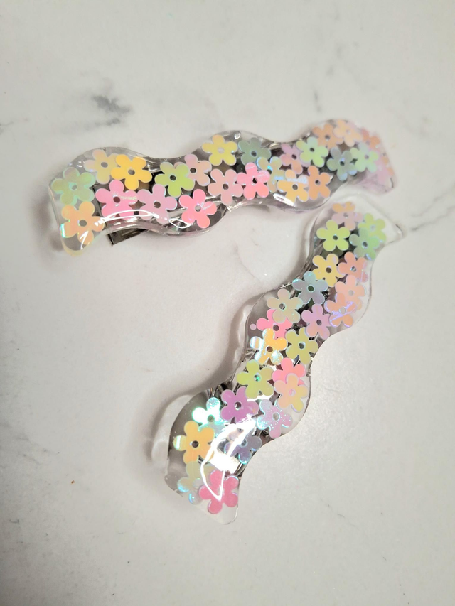 Cute spring flower sequin wiggle clip pair made from lightweight uv resin and stainless steel.